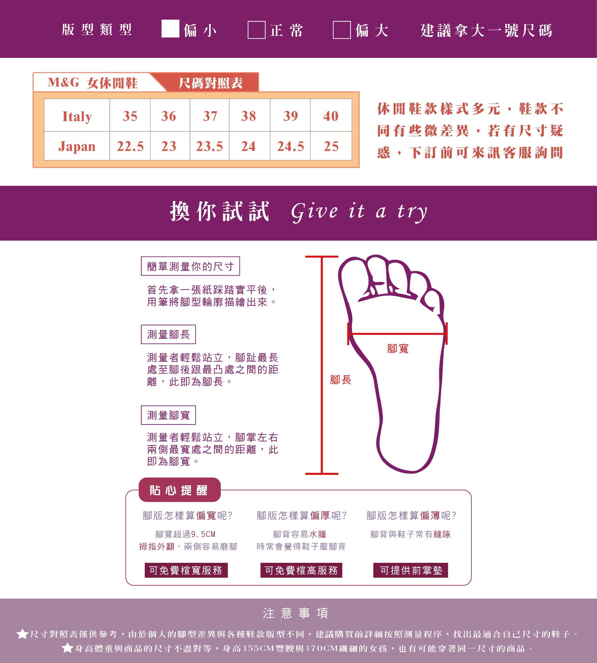 版型偏小,感受度喜歡寬鬆、腳版偏寬厚者,建議可選購大一號