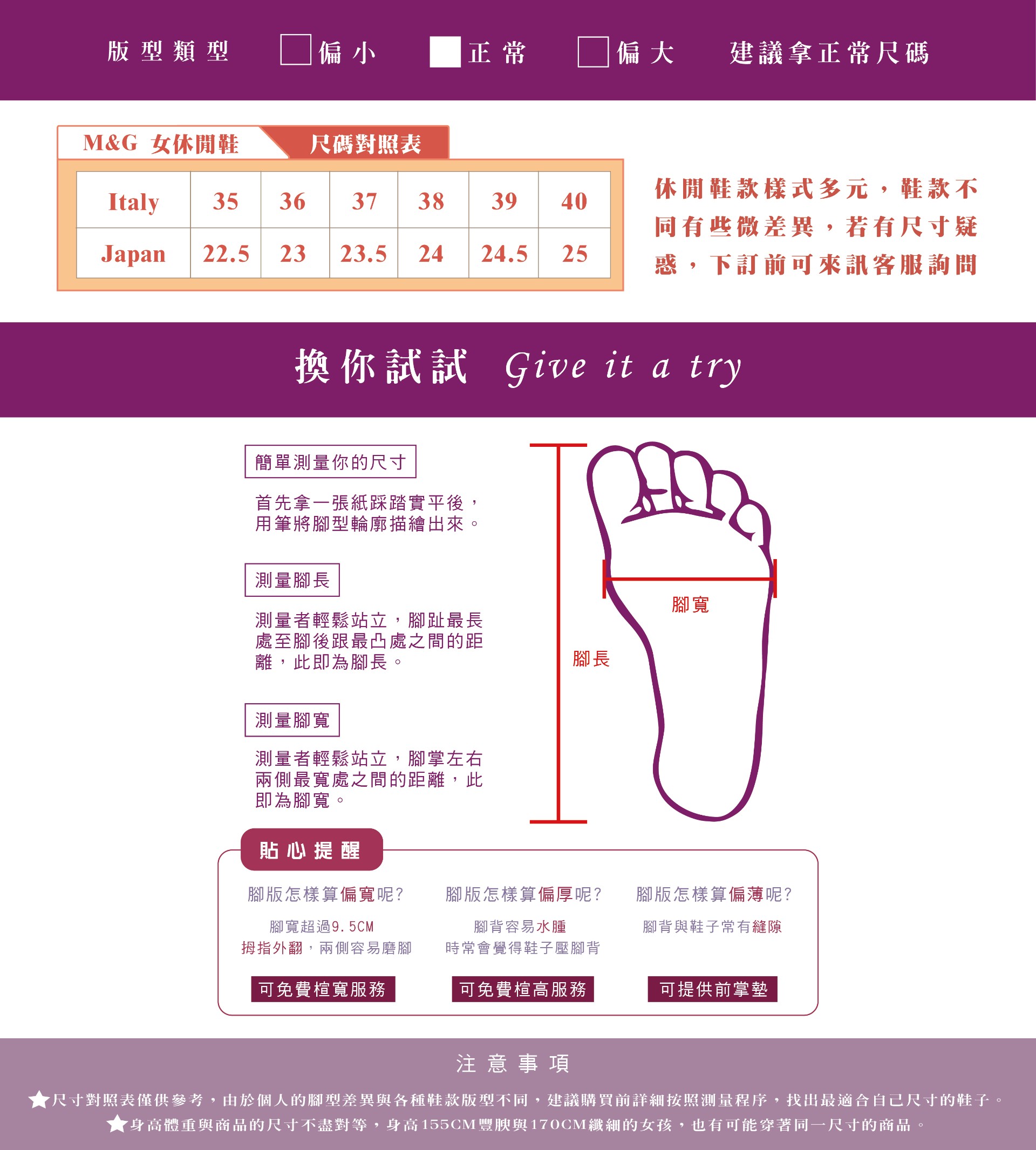 版型正常,感受度喜歡寬鬆、腳版偏寬厚者,建議可選購大一號